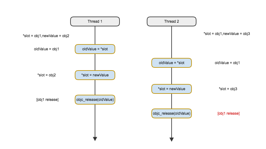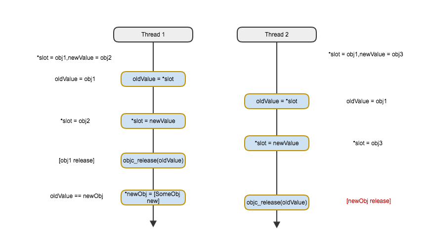 仔细观察上图展示的问题,假设在thread 1释放obj1占用的内存后又立刻对其进行重新分配值newObj。此时,thread 2 的局部变量oldValue与newObj指向同一块内存空间。会有什么问题产生?wow!oldValue会对刚刚创建的newObj进行release操作!这就给程序带来了更大的不确定性,此时对于newObj的引用计数永远比指向newObj的强引用数少1。也就是在某些未知的情况下newObj就会被释放,导致内存错误。当然,也有可能导致上述的objc_msgSend问题。